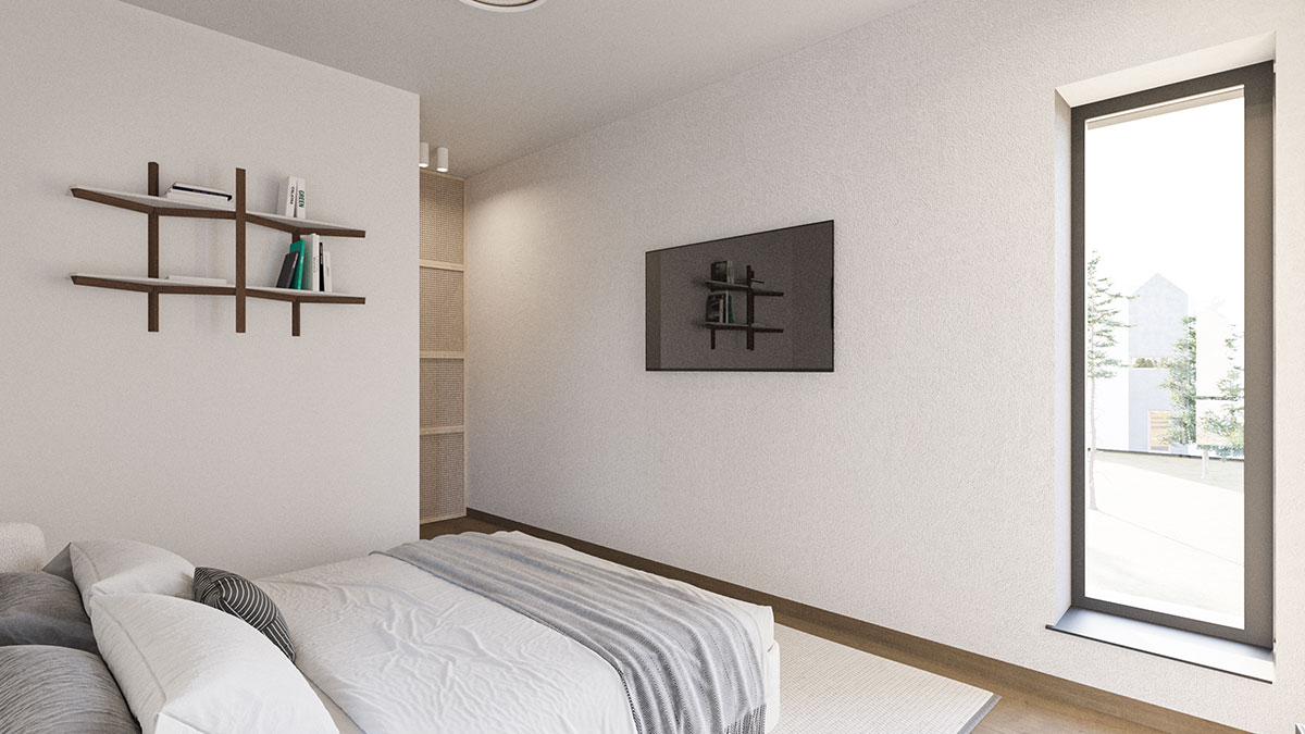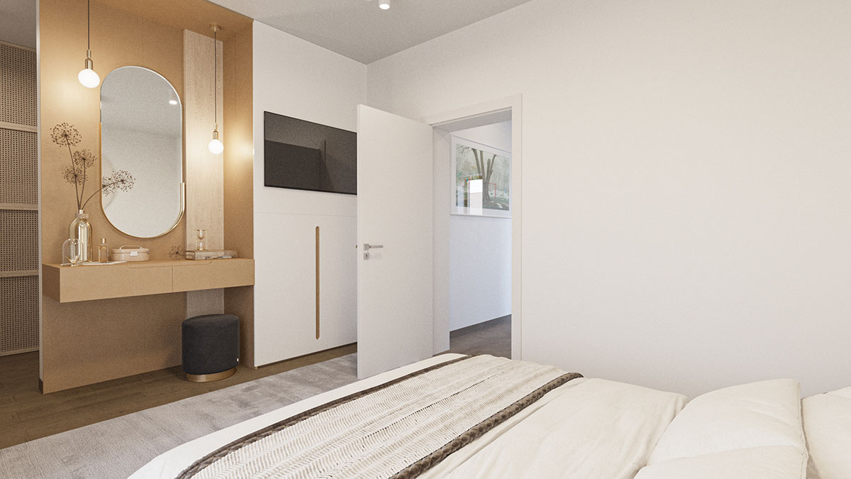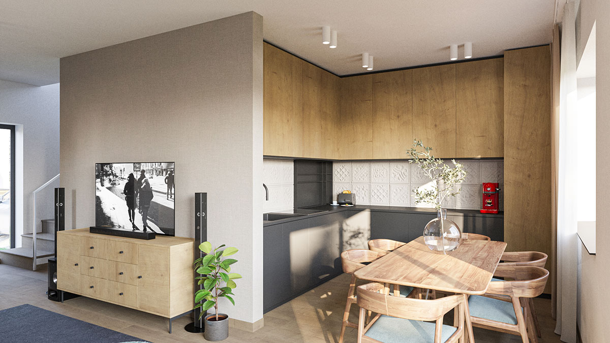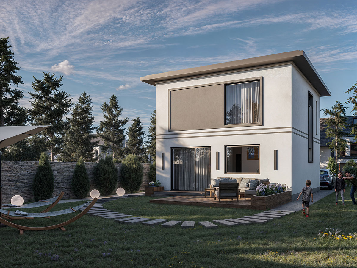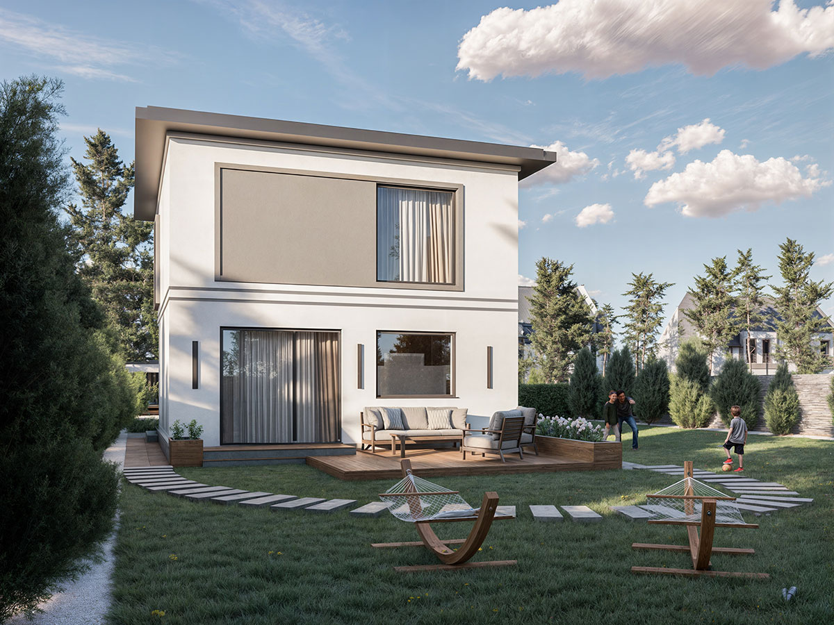 VILA ZEN beneficiaza de 3 camere, din care 2 sunt dormitoare, fiecare cu dressing propriu, living spatios, doua bai, bucatarie moderna, loc de luat masa si terasa.